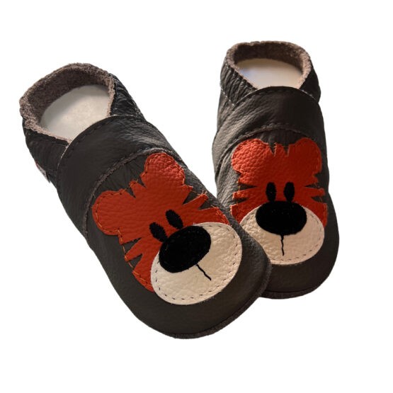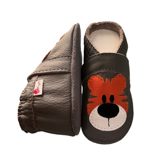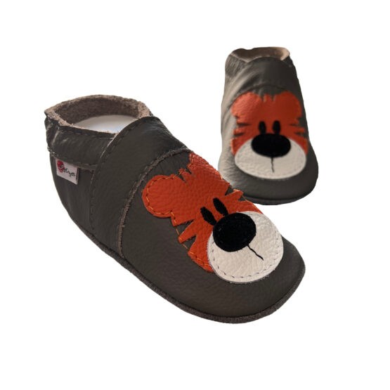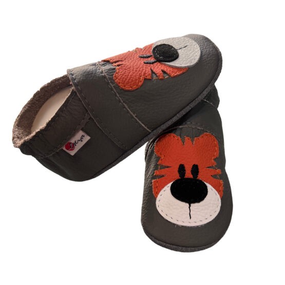 Krabbelschuhe Grau mit je einem Tiger pro Schuh in Orange
