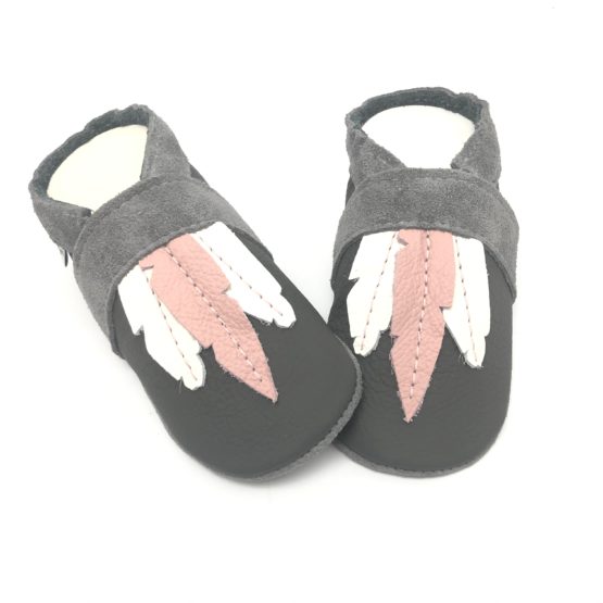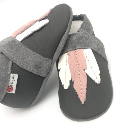 mit Veloursleder Sohle. Das Lederpuschenmodell „Federn“ in dunkel Anthrazit / Rosa ist einfach und schick in pastelltönen gehalten.